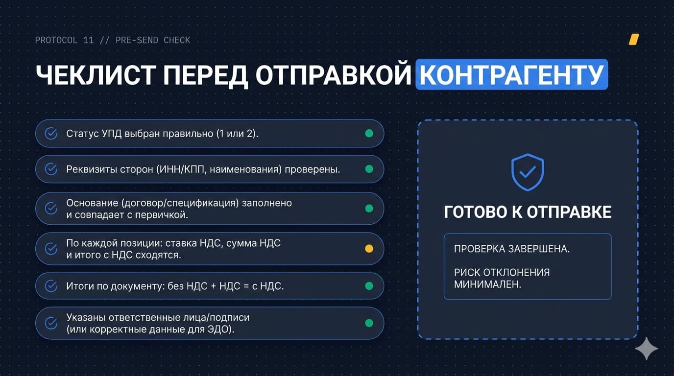 Если вы делаете УПД со статусом «1», он закрывает роль счета‑фактуры. Это означает, что внимание бухгалтерии будет в первую очередь на НДС‑части: