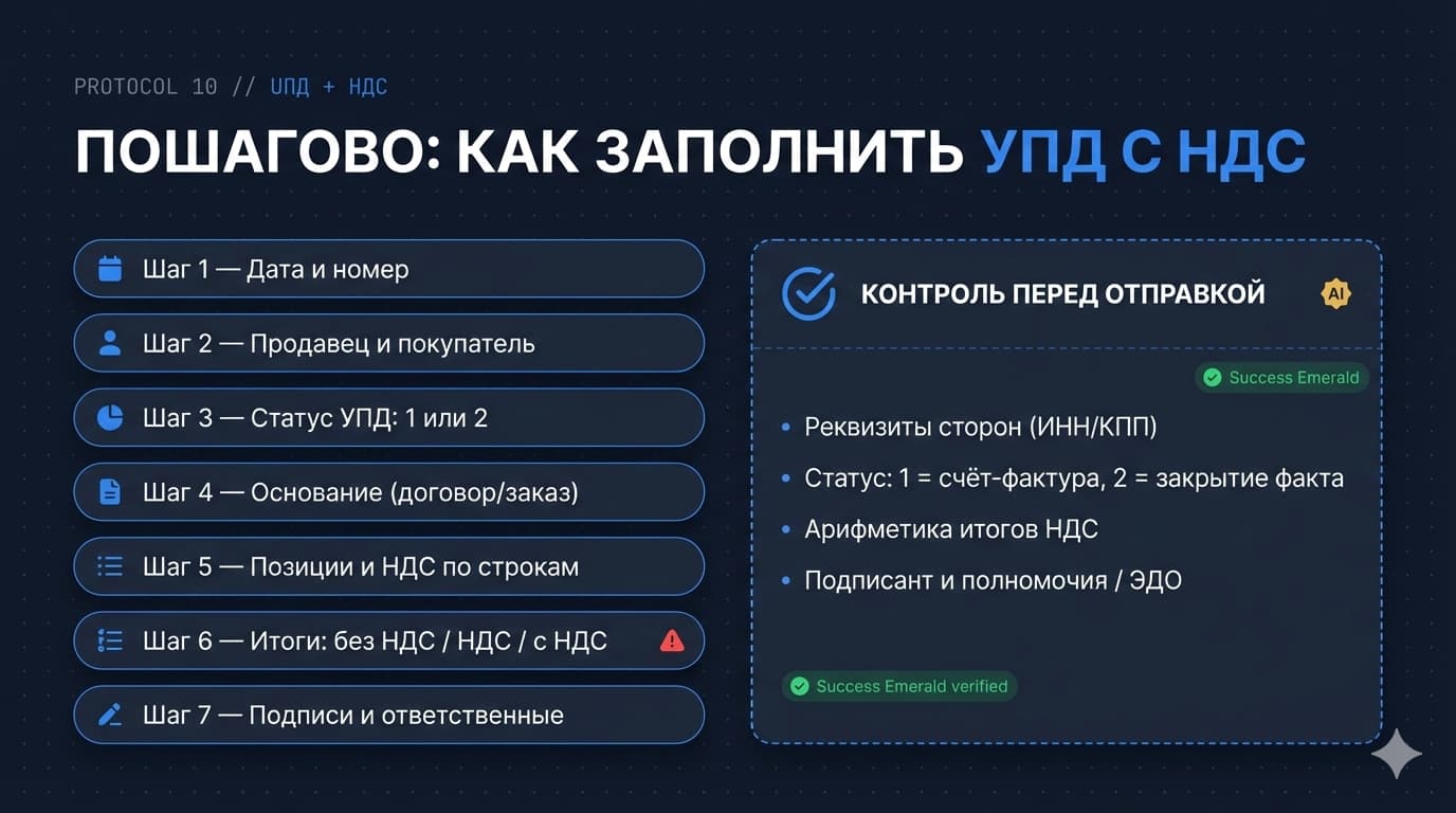 УПД со статусом «1» часто используют как первичный документ и как счет‑фактуру одновременно — поэтому ошибки в НДС здесь самые дорогие: документ не сходится по суммам, контрагент просит переделать, а бухгалтерия теряет время.
