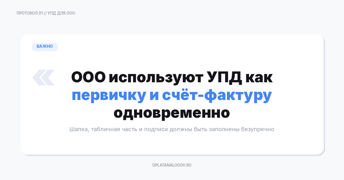 ООО используют УПД одновременно как первичку и счёт-фактуру. Поэтому важно, чтобы шапка, табличная часть и подписи были одинаковыми во всех системах: ЭДО, учёт, согласование и бухгалтерия контрагента.