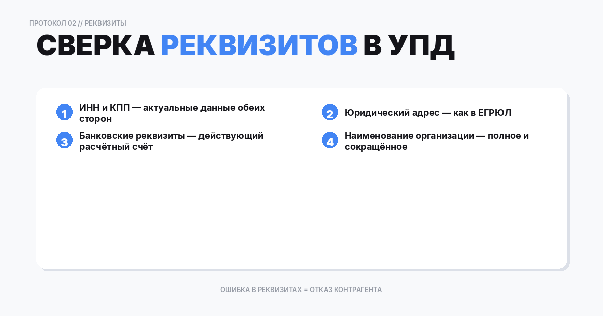 - ИНН/КПП — КПП особенно критичен для автоматической сверки.