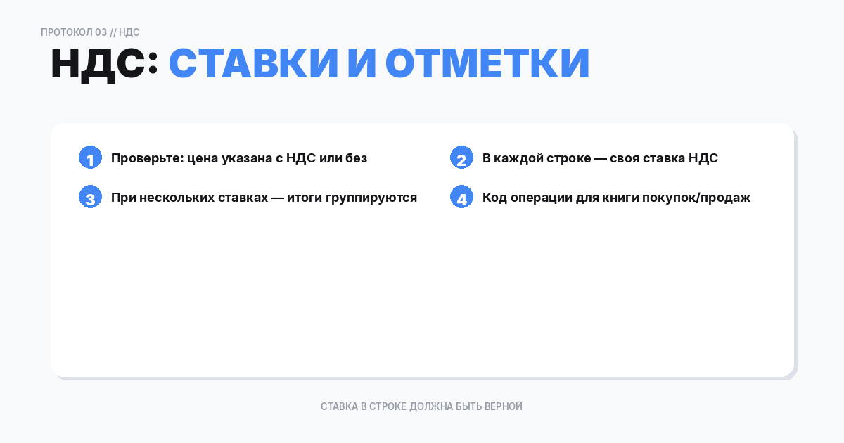 В одном УПД может быть несколько ставок. Зафиксируйте: указана ли цена с НДС или без, какие ставки по строкам и как вы округляете суммы.