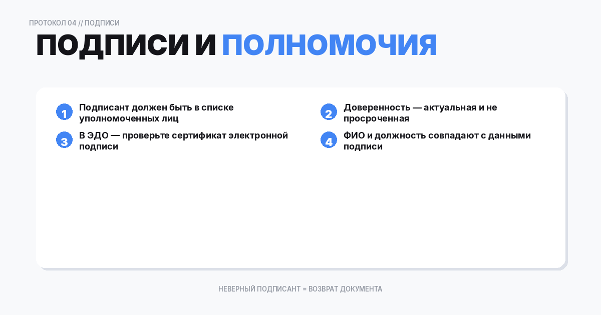 В ЭДО документы часто возвращают из-за неподтверждённого подписанта. Держите список разрешённых подписантов, доверенности/МЧД и расшифровки подписи. В бумаге дайте должность и ФИО с расшифровкой.