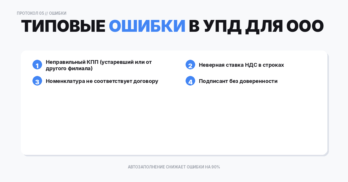УПД для ООО — документ, который проходит через учёт, ЭДО и контрольные комиссии. Ошибки в реквизитах, ставке НДС и табличной части приводят к возвратам и потерям времени. Этот материал — практичный чек-лист, чтобы каждое УПД проходило с первого раза.