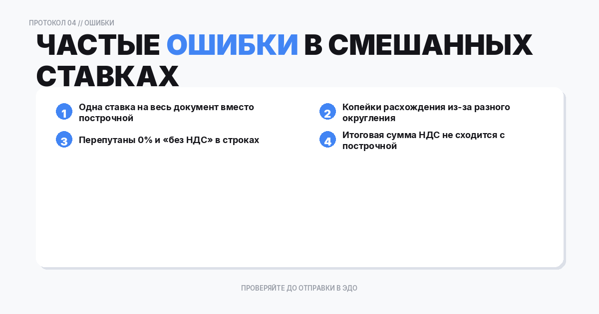 Если контрагент часто отклоняет смешанные ставки или у него сложные регламенты, проще разделить документы на два: по ставкам или по группам товаров.