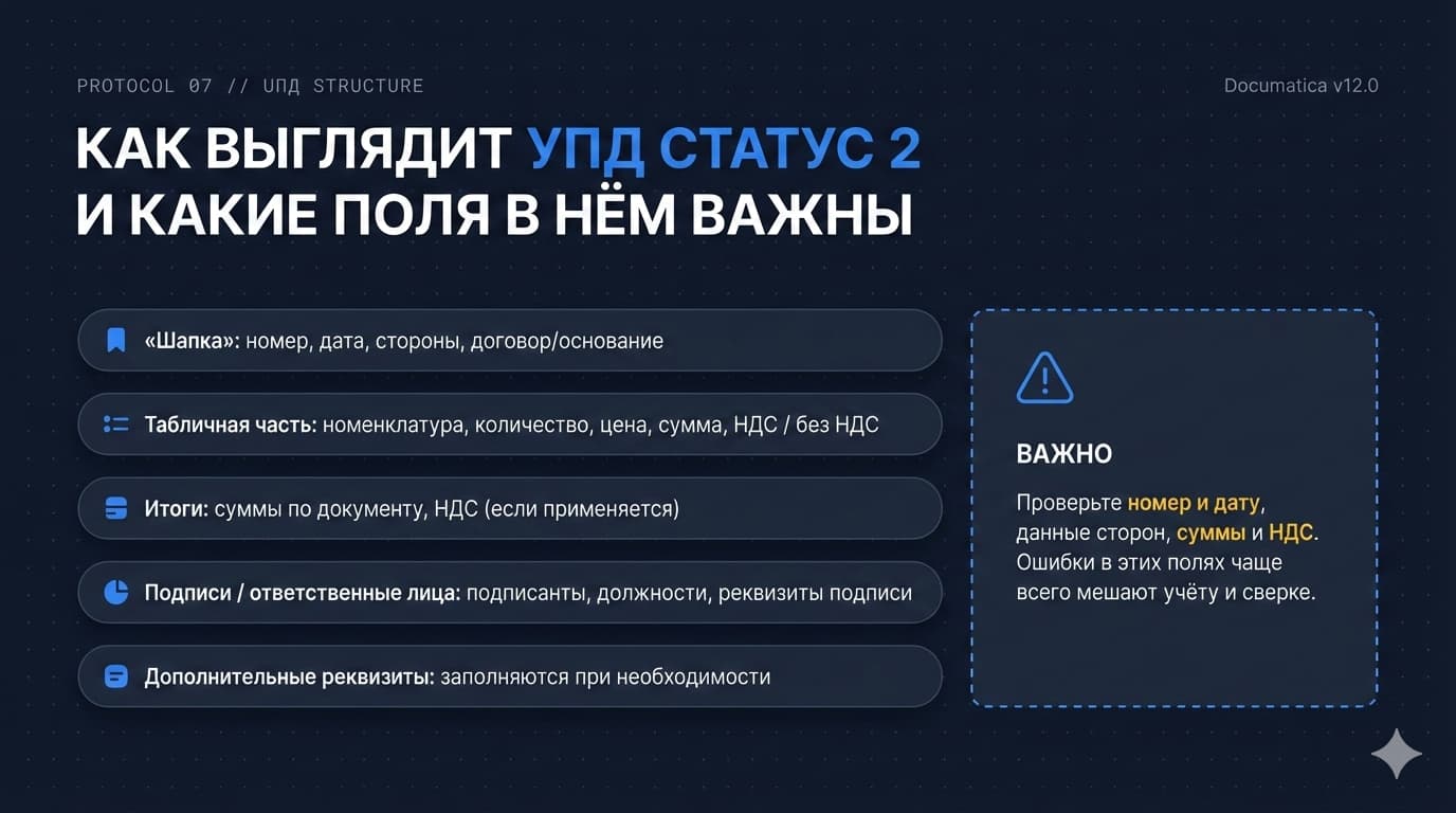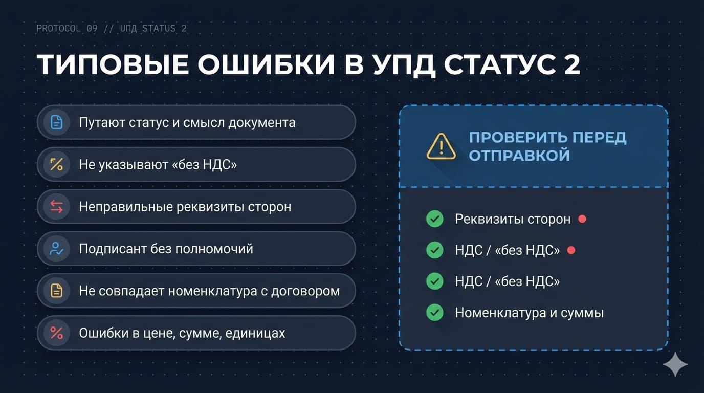 Важно: статус 2 — это не «упрощенная версия» статуса 1. Это другой смысл документа. Ошибка «поставили статус 2, но заполнили как счет‑фактуру и учли НДС» может привести к некорректным данным по НДС и претензиям при сверках.