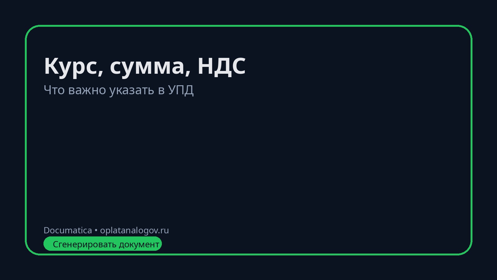 Если используете УПД как счёт‑фактуру (статус «1»), проверьте, чтобы реквизиты по НДС заполнялись корректно и совпадали с договором.